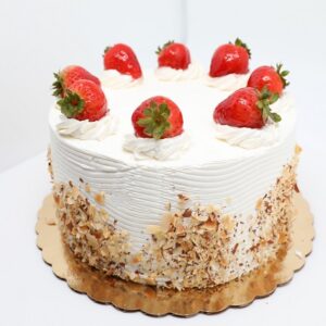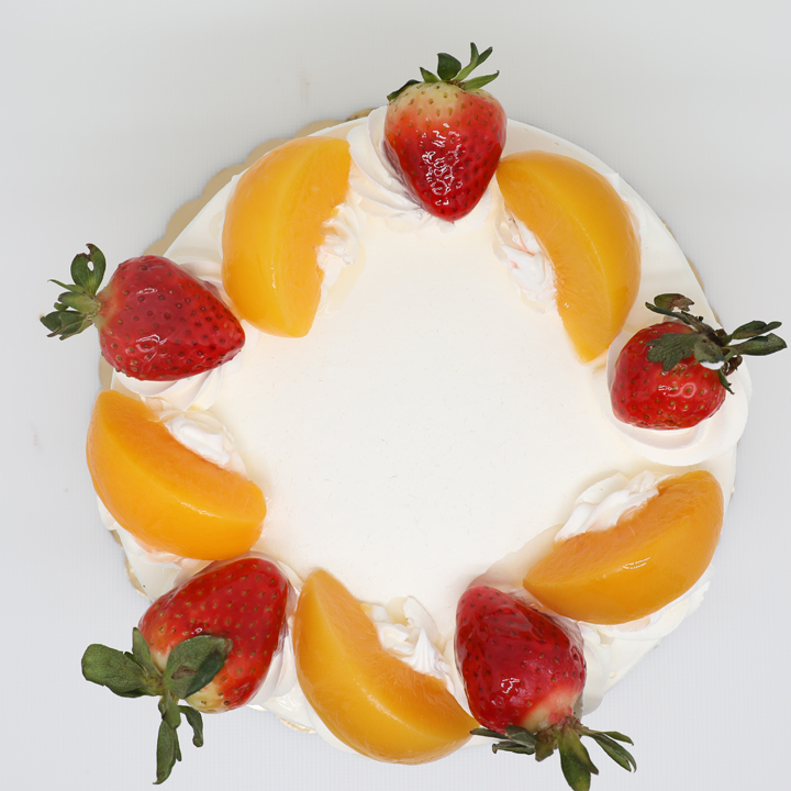 A light white cake layered with fresh strawberries and peaches topped with an airy whipped cream and cookie crumbs.